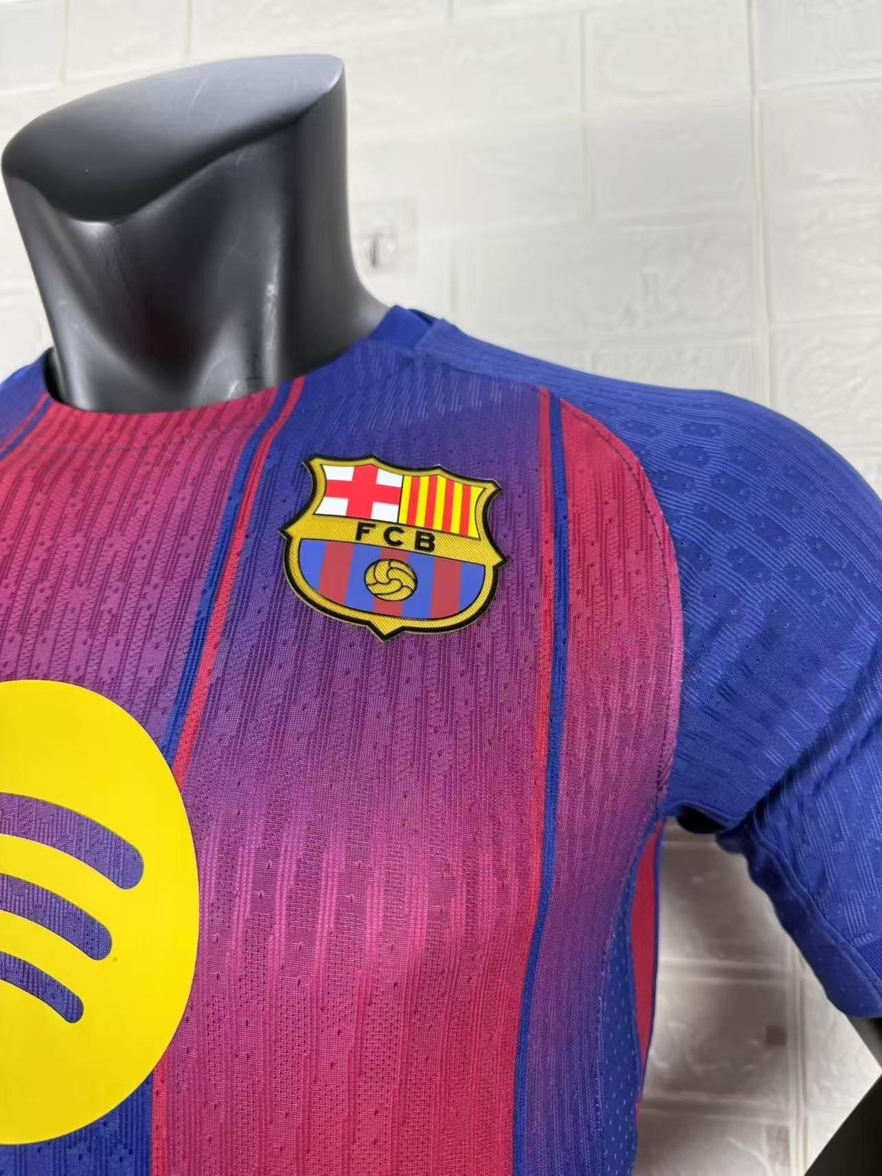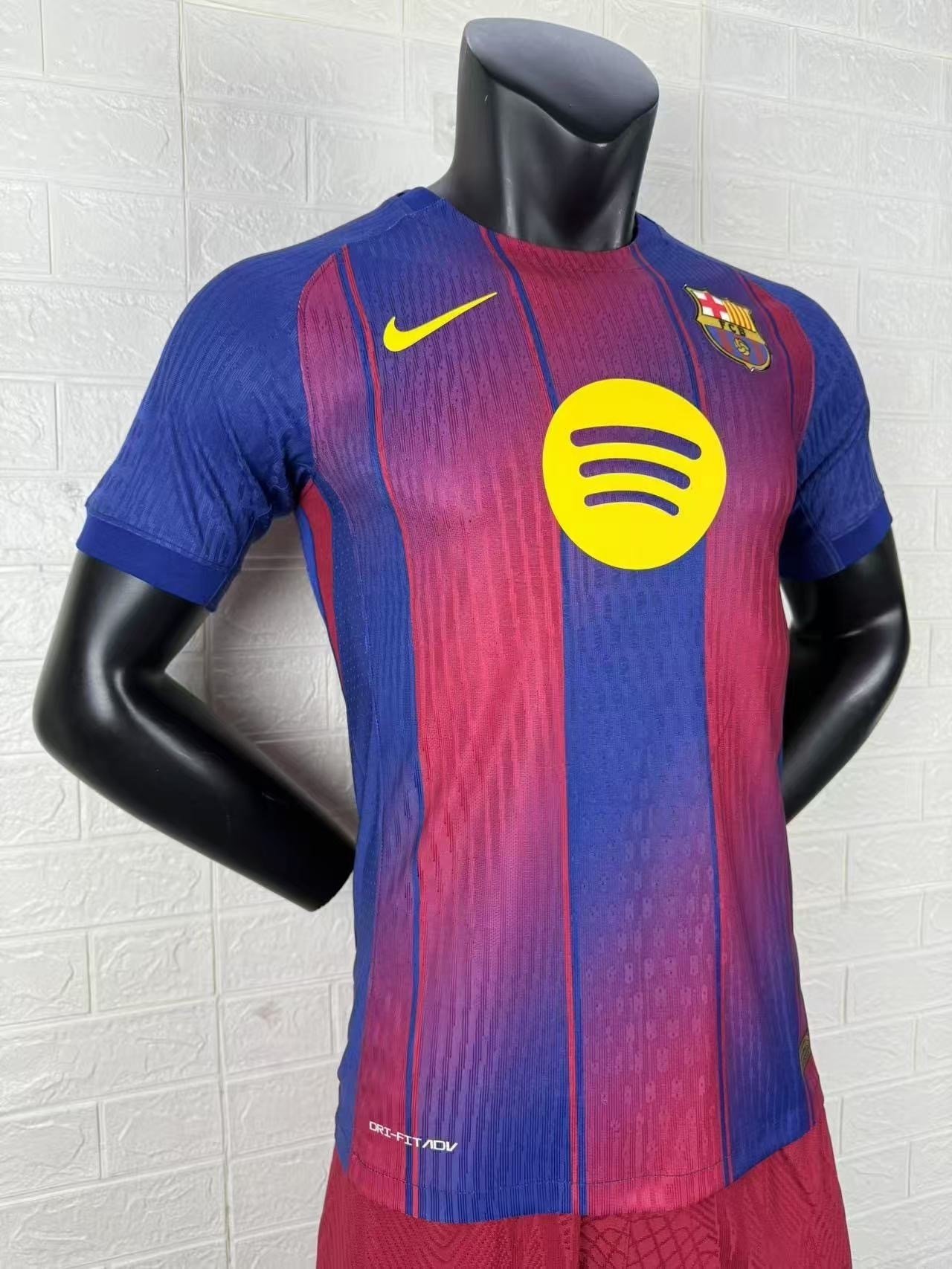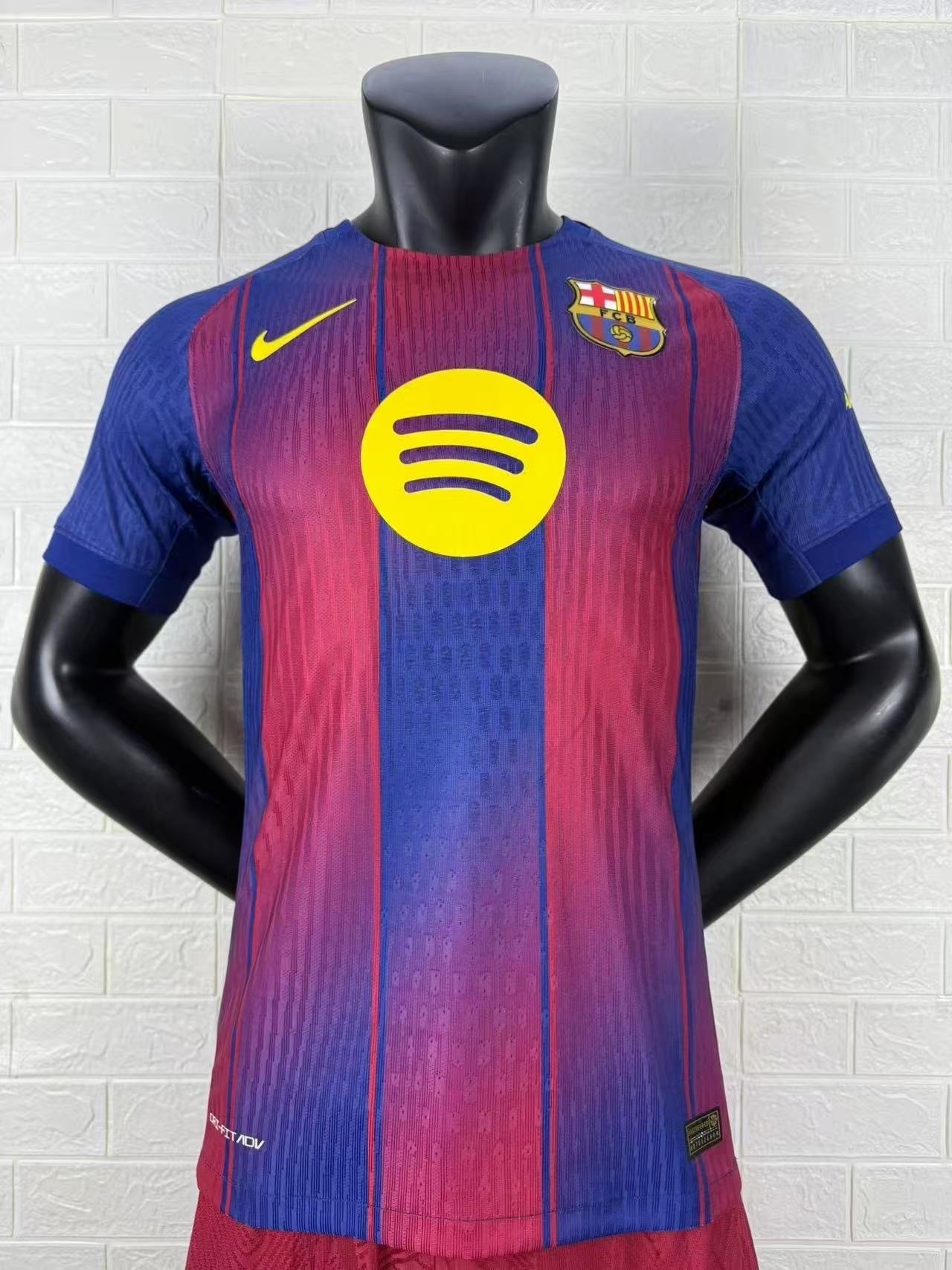 All logos on the jersey — including the Nike Swoosh, Spotify sponsor, and FC Barcelona crest — are presented in a bright yellow finish, offering a sharp contrast that stands out proudly against the dark base. 🌟