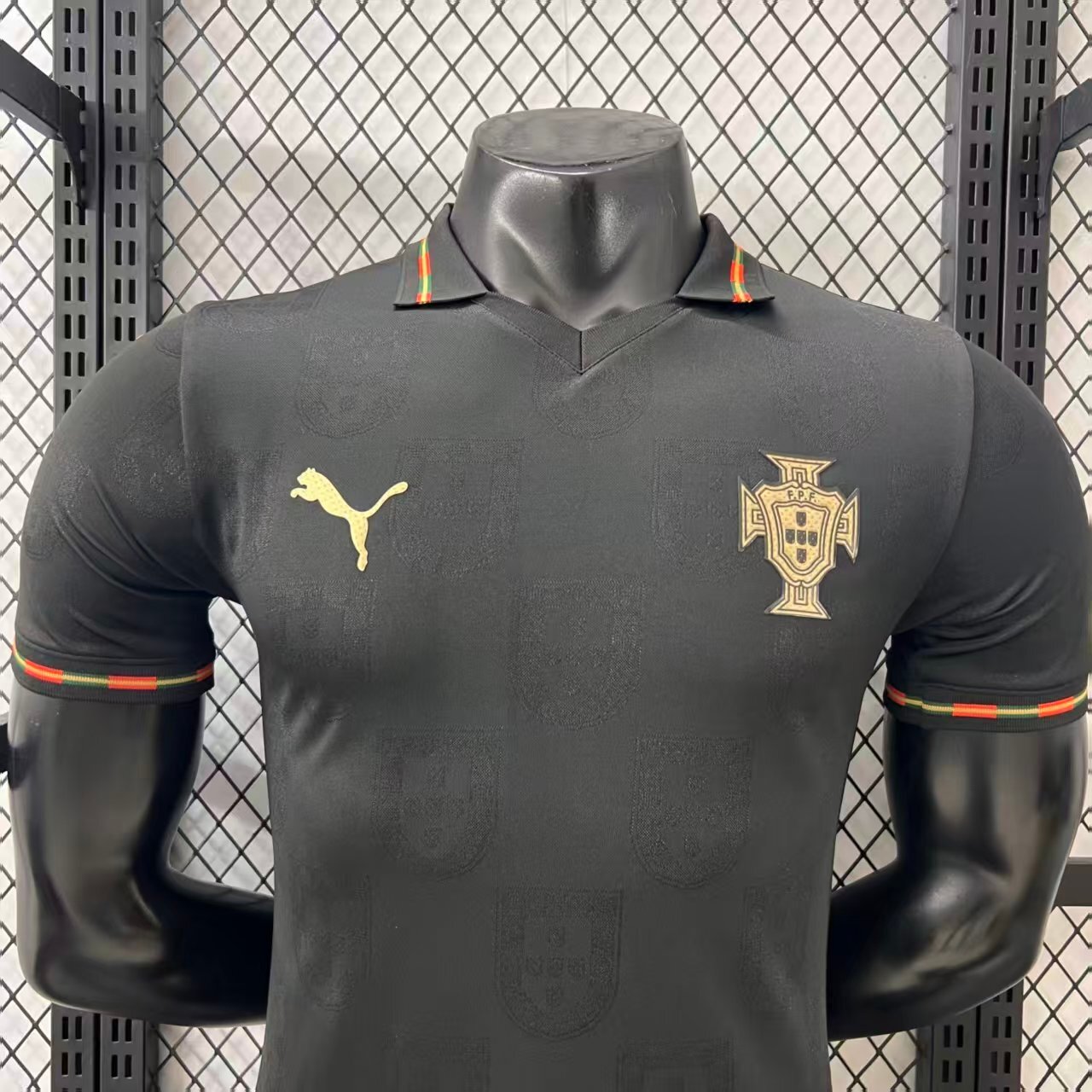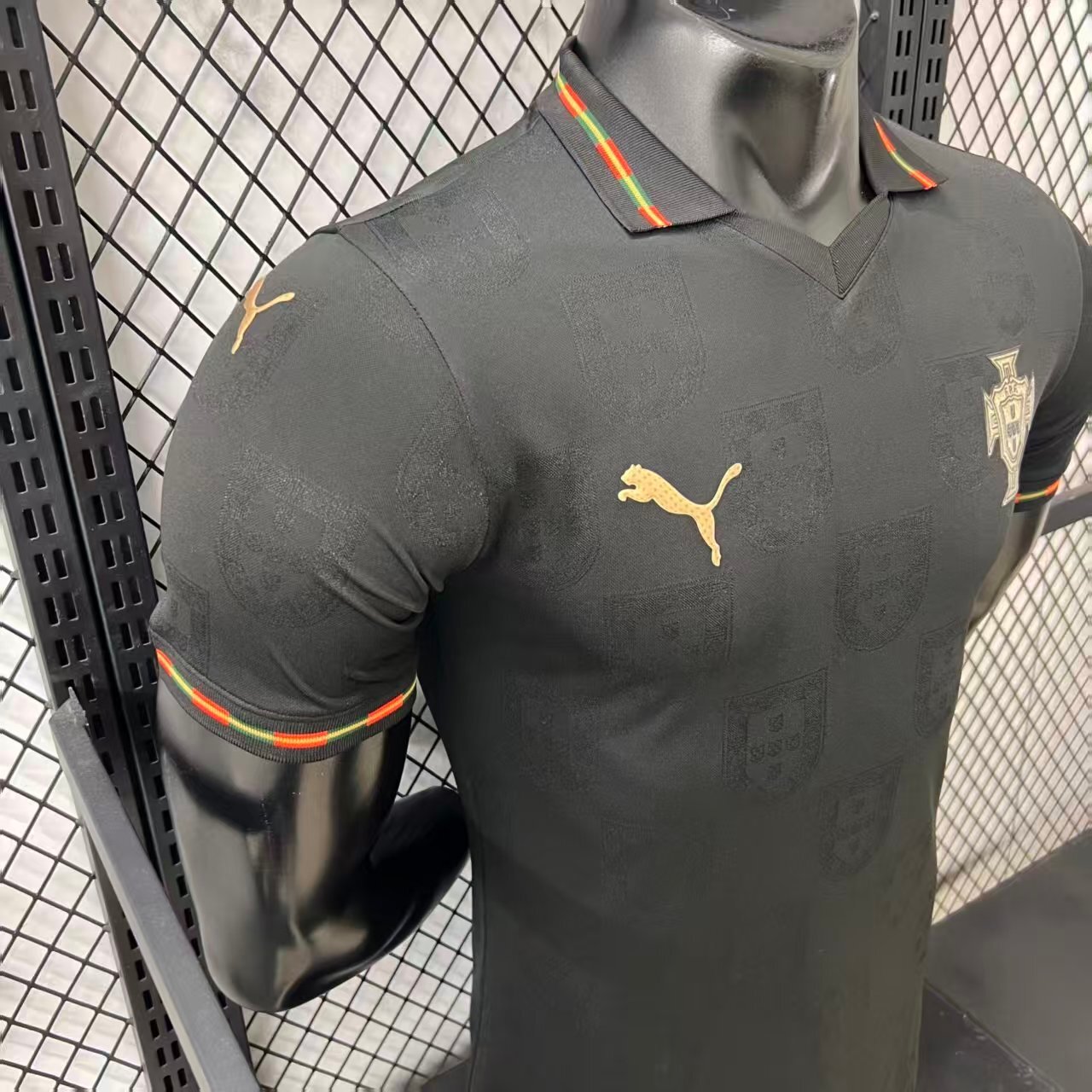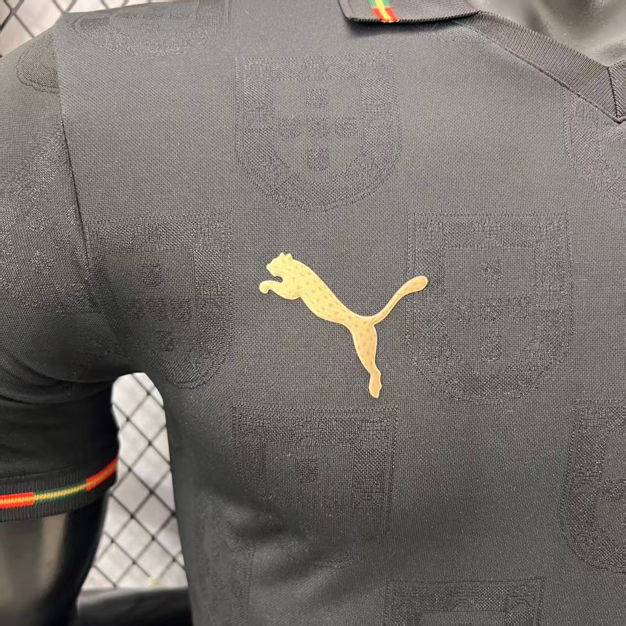 The jersey features a deep black base, symbolizing authority and intensity, enhanced with subtle tonal patterns inspired by a panther’s movement and strength. Carefully placed red and green accents reflect Portugal’s national colors, creating a striking contrast that embodies pride and passion. 🖤❤️💚