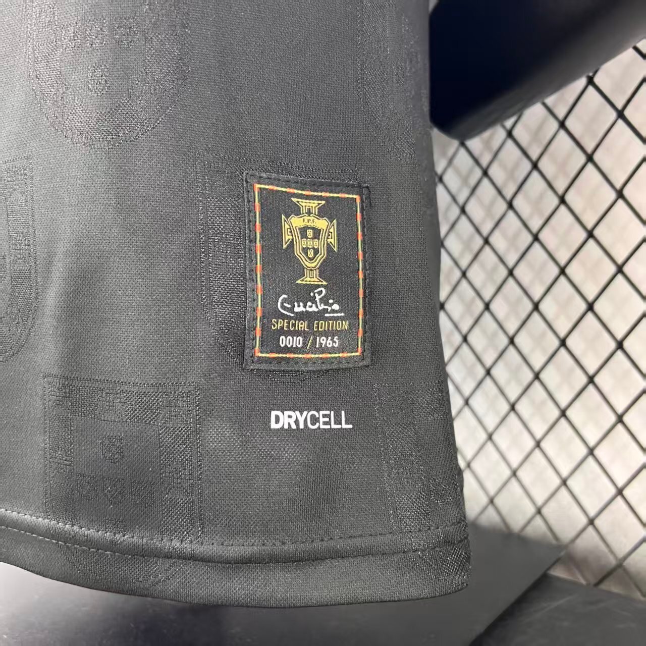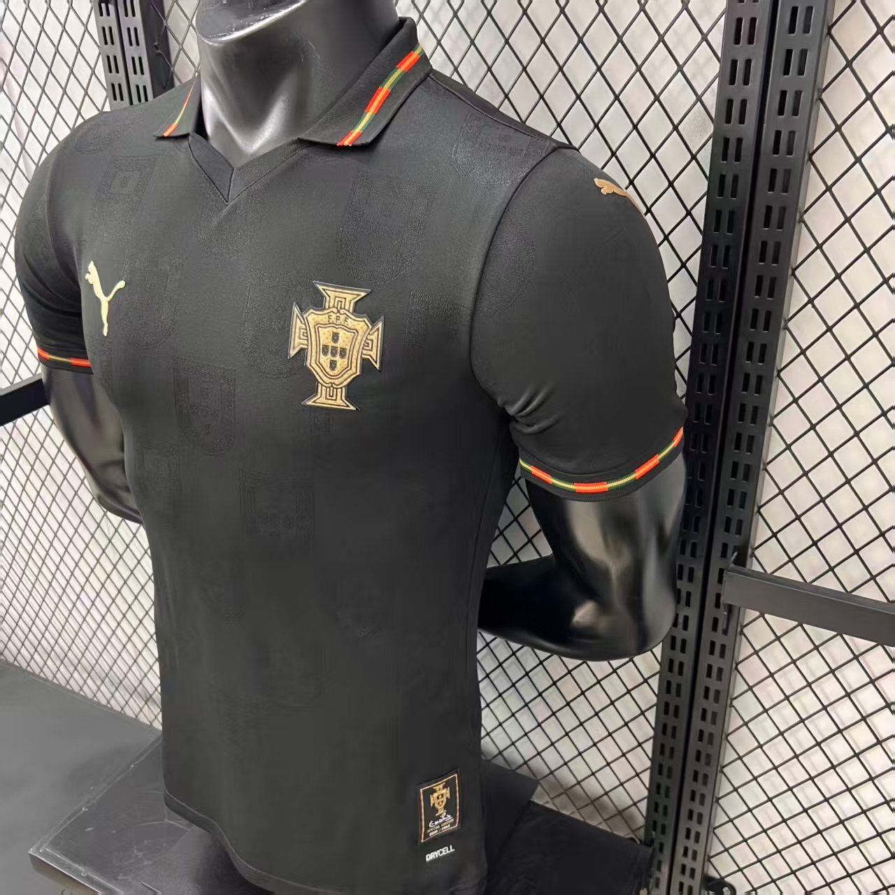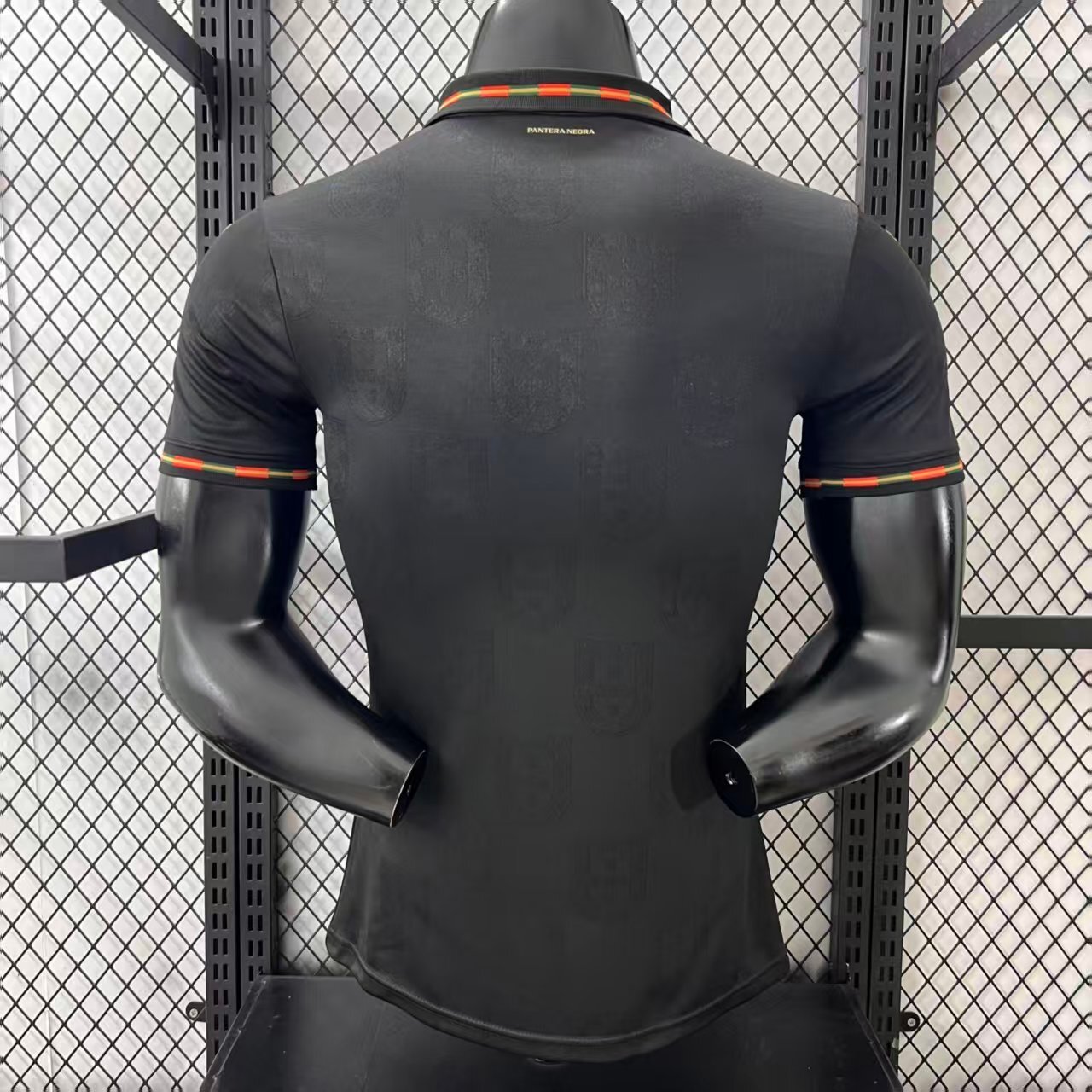 The jersey features a deep black base, symbolizing authority and intensity, enhanced with subtle tonal patterns inspired by a panther’s movement and strength. Carefully placed red and green accents reflect Portugal’s national colors, creating a striking contrast that embodies pride and passion. 🖤❤️💚